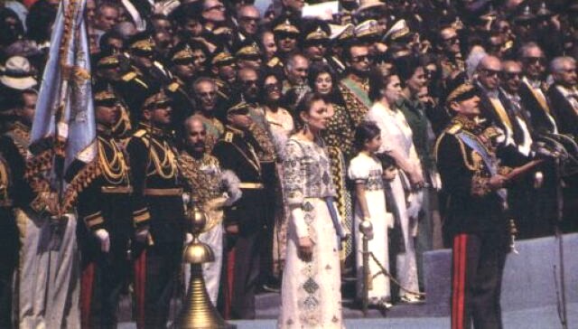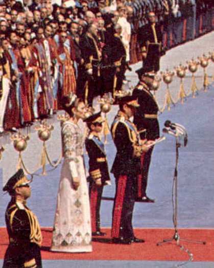 Shortly before noon, the helicopter in which the Imperial Family of Iran travelled arrived at Pasargadae. To the sound of military music, the Shah, wearing his uniform of commander of the three services of the Armed Forces and the highest Iranian decorations, with the Shahbanou on his right and the Crown Prince (also in uniform and wearing the Collar and the Ribbon of the highest Iranian order, the Order of Pahlavi) on his left, slowly walked the length of the blue carpet, saluting from time to time to the military officers among the guests, on the right of the carpet. The Empress wore her fantastic Seven Emeralds Tiara along with a fantastic cream-coloured dress, with embroidery in gold and silver, inspired, it was said, by ancient dresses of wives of Persian emperors. Meanwhile, from the mountains around sounded 101 canon blasts to celebrate the auspicious event.