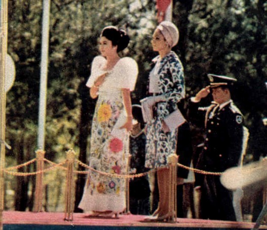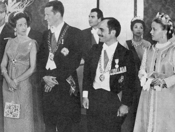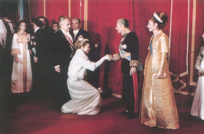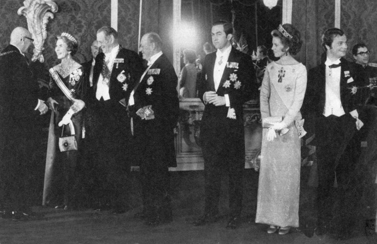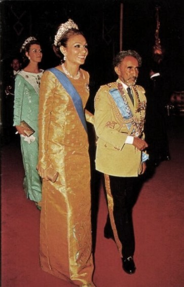 At the end of the compliments, the Shah, in his impressive uniform of Commander of the Armed forces and wearing the collar and ribbon of the Nishan-i-Pahlavi, the Order of Pahlavi, led Her Majesty the Queen of Denmark to the Banqueting Hall. The Shahbanou, wearing a fantastic gold-woven dress embroidered in silver (designed, woven and cut by Iranian women, like all the dresses she wore during the celebrations) and the blue sash of the Nishan-i-Aryamehr, the Order of the Light of the Aryans, was led by His Imperial Majesty The Emperor of Ethiopia and they were followed by members of European royalty and others heads of state, like Their Majesties the King and Queen of the Hellenes.