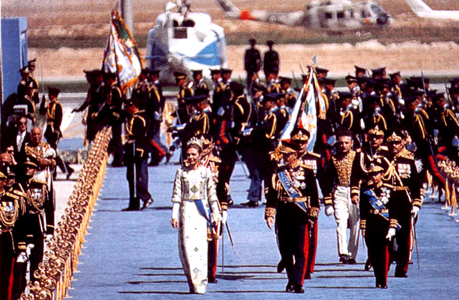 Shortly before noon, the helicopter in which the Imperial Family of Iran travelled arrived at Pasargadae. To the sound of military music, the Shah, wearing his uniform of commander of the three services of the Armed Forces and the highest Iranian decorations, with the Shahbanou on his right and the Crown Prince (also in uniform and wearing the Collar and the Ribbon of the highest Iranian order, the Order of Pahlavi) on his left, slowly walked the length of the blue carpet, saluting from time to time to the military officers among the guests, on the right of the carpet. The Empress wore her fantastic Seven Emeralds Tiara along with a fantastic cream-coloured dress, with embroidery in gold and silver, inspired, it was said, by ancient dresses of wives of Persian emperors. Meanwhile, from the mountains around sounded 101 canon blasts to celebrate the auspicious event.