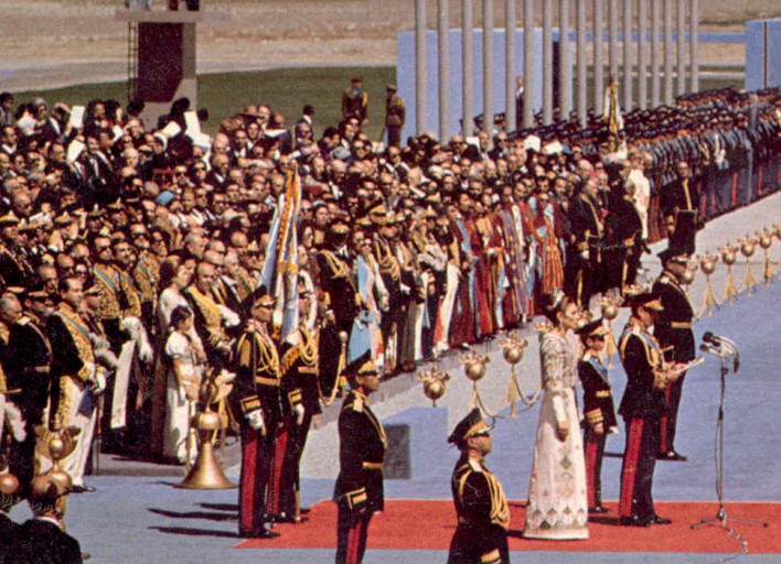The opening of the celebrations of the 2500th anniversary of the Persian Empire took place on the 12th October 1971 in Pasargadae, the ancient capital of the time of Cyrus the Great, the founder of the Empire, who was buried there in a simple but remarkable tomb. The ruins of Pasargadae had been arranged for the ceremony: hundreds of trees had been planted around Cyrus tomb and the ground had been specially prepared to allow the hundreds of military to form their regiments; a long blue carpet had been set from the place where the imperial helicopter would arrive towards the front of the tomb, forming an “L”. In the intersection of the two parts of the carpet was a red carpet, where the Imperial Family would stand during the Shah’s Speech, which would mark the opening of the celebrations.